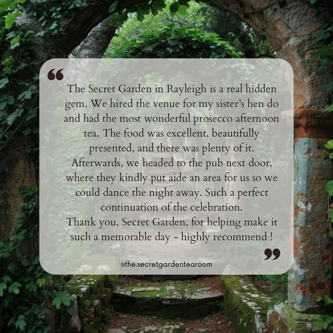 Welcome to The Secret Garden Tearoom! Discover a sanctuary of flavours and tranquillity nestled in our enchanted secret garden in Rayleigh high street.